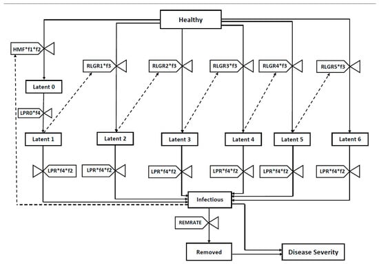 - Berger, R.; Jones, J. A general model for disease progress with functions for variable latency and lesion expansion on growing host plants. Phytopathology 1985, 75, 792–797. [Google Scholar] [CrossRef]