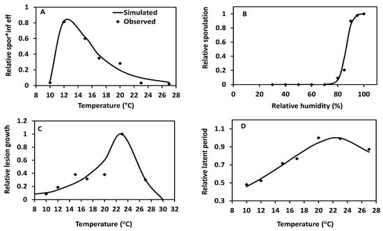 Response curves for parameter estimates used in the model BLIGHTSIM. All data except those in B were obtained from growth chamber experiments performed on potato cv Red LaSoda using an isolate of Phytophthora infestans clone US-23 []. The data for A, C and D were fitted with a four-parameter thermodynamic model (Table S1). The data for B were fitted using a logistic regression model is SAS (version 9.4). A, effect of temperature on relative sporulation*infection efficiency; B, effect of relative humidity on sporulation of P. infestans race 4,10,11 on potato cv Bintje []; C, effect of temperature on relative radial lesion growth rate; and D, effect of temperature on relative latency progression rate.
