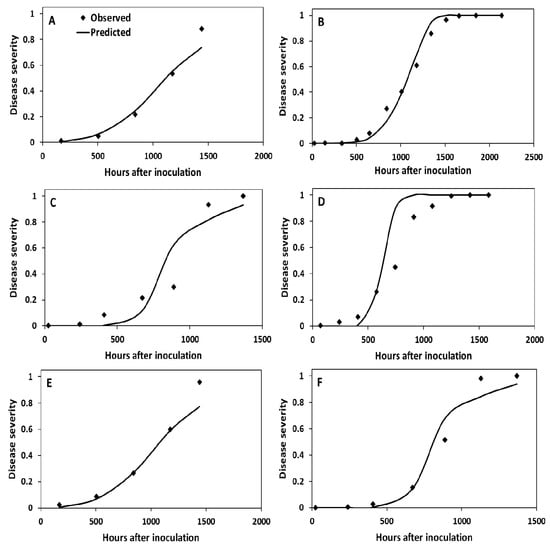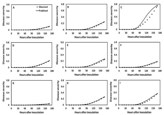 When the model outputs were evaluated over a 168 h time course at seven constant temperatures ranging from 10 °C to 27 °C, and a good fit was obtained to the observed disease severity data (Figure 3A–C and Figure S1). The R2 of the simulated versus observed data was above 0.934 in all cases. The simulated disease severity increased at increasing average temperatures from 10 °C to 23 °C as observed in the growth chamber experiment and decreased beyond that temperature. The final observed and predicted disease severities were highest (74%) at 23 °C and lowest (1.7%) at 10 °C.