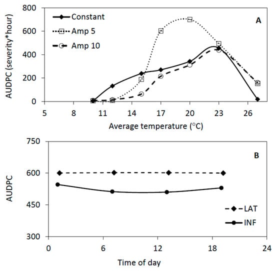 Both average temperatures and diurnal amplitudes are expected to increase in the Andean highlands []. These changes in climate may have contributed to the recent increase in late blight at high altitudes []. Greater temperature amplitudes at relatively low average temperatures in the highlands could result in a shorter latent period compared to smaller amplitudes, and possibly in higher infection efficiency, but not in greater lesion growth and sporulation intensity []. Thus, the overall effect of greater amplitudes on these epidemic components cannot be predicted a priori. Another complication is that maximum temperatures are expected to occur later in the afternoon [], so that dew periods and high RH may last longer in the morning []. This may enable spore release and infection to occur in the same morning, reducing the risk of spore desiccation and death due to UV radiation in the afternoon [,,,,]. However, it is difficult to predict the effects of climate change on epidemic development based on the potential effects on individual processes in the infection cycle. A simulation model such as BLIGHTSIM could potentially better integrate the effects of climate change on various stages in the infection cycle and predict late blight development more accurately under a range of climate scenarios. Contrary to intuitive predictions, enhanced temperature amplitudes may result in reduced late blight development at low average temperatures, but not at intermediate average temperatures, as shown in this paper (Figure 5A). Thus, an increase in average temperature and temperature amplitude could indeed result in increased late blight development as observed in recent years.