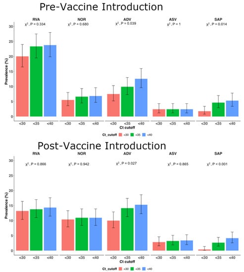 Detection frequency of RVA, adenovirus, norovirus GII, astrovirus and sapovirus at different cycle threshold (Ct) cutoffs for children under 5 years of age admitted to KCH Kenya with diarrhea symptoms. The error bars represent 95% confidence interval for the proportions. Proportions were compared using chi-square test. RVA stands for rotavirus group A, ADV stands for adenovirus, NOR stands for norovirus GII, ASV stands for astrovirus and SAP stands for sapovirus.