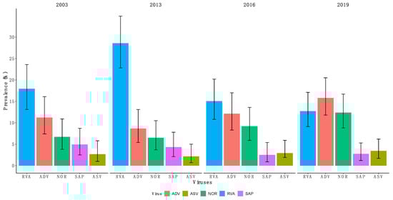 Prevalence of RVA, adenovirus, norovirus GII, astrovirus and sapovirus in 2003, 2013, 2016 and 2019 in children under 5 years of age admitted to KCH Kenya with diarrhea symptoms. The error bars represent 95% confidence interval for the proportions. Proportions were compared using chi-square test. Abbreviations used for viruses as in Figure 1.