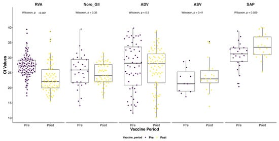 Distribution of Ct values among cases under 5 years of age admitted to KCH Kenya with diarrhea symptoms pre- and post-vaccine introduction. RVA stands for rotavirus group A, ADV stands for adenovirus, NOR GII stands for norovirus GII, ASV stands for astrovirus and SAP stands for sapovirus.