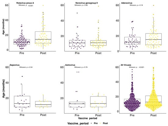 Notably, RVA and sapovirus cases in the post-vaccine introduction period had statistically significant lower and higher median Ct values, respectively, compared to the pre-vaccine period (Wilcoxon, p value < 0.001); see Figure 3. This was not observed for the other three screened viruses pre- and post-rotavirus vaccine introduction. The median age of the RVA positive cases was significantly higher for the post-vaccine introduction period (14.0 months) compared to the pre-vaccine introduction period (10.4 months) (Wilcoxon, p < 0.001). A similar shift was not observed for the other viruses; see Figure 4.