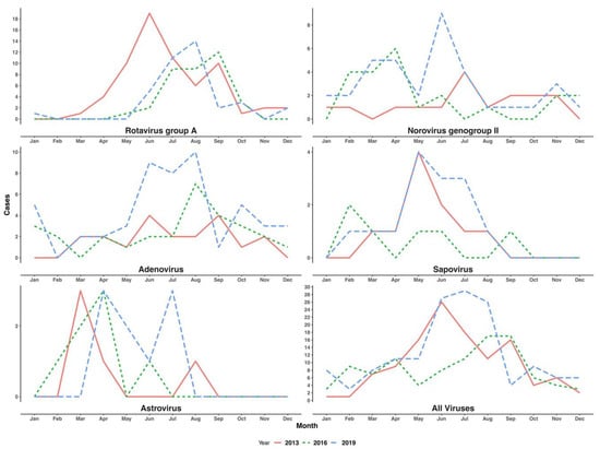 We constrained this analysis to the years 2013, 2016 and 2019, where >70% of the eligible patients had been analyzed. Pre-vaccine introduction (in 2013), for RVA, there were two peak months, in June and September. However, post-vaccine introduction (in 2016 and 2019), there was only a single peak month for RVA in September and August, respectively. For norovirus GII, cases were observed throughout the year, with peak months varying from year-to-year, in July, April and June in 2013, 2016 and 2019, respectively. Similarly, adenovirus cases appeared to occur throughout the year, with two peak months in 2013 (June and September) and one peak month in 2016 and 2019 (August for both). For sapovirus and astrovirus, we observed less than five cases monthly between January and August and no cases in the last quarter of each the three years; see Figure 5.
