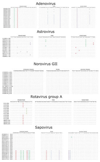 Nucleotide mismatches were observed in either or both the primers and probes and the viral target sequences for all the viruses except for norovirus GII; see Figure 6. The RVA forward primer had a G-A and A-G mismatches at positions 12 and 15, respectively. Adenovirus had two mismatches in the forward primer (C-G and G-A), three mismatches in the probe (C-T, C-T and T-C) and two mismatches in the reverse primer (T-C and C-T), and none of them were within five bases of the 3′ end. Mismatches within the sapovirus primer/probe binding sites were pronounced in sapovirus genogroup V and included six mismatches in the forward primer, three mismatches in the probe and two mismatches in the reverse primer. Some of the mismatches were within five bases of the 3′ end (forward primer: C-G, probe: T-C, reverse primer: A-C and T-C). Astrovirus primers and probe did not have pronounced mismatches present in all the sequences—rather, they had mismatches in individual sequences; see Figure 6.