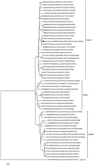 - da Silva, M.F.; Tort, L.F.; Goméz, M.M.; Assis, R.M.; Volotão, E.d.M.; de Mendonça, M.C.; Bello, G.; Leite, J.P. VP7 Gene of human rotavirus A genotype G5: Phylogenetic analysis reveals the existence of three different lineages worldwide. J. Med. Virol. 2011, 83, 357–366. [Google Scholar] [CrossRef]