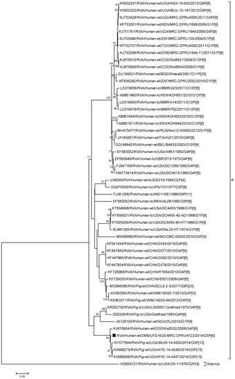 The G5, one of the most common porcine genotypes, has sporadically been identified in human populations in Brazil (G5P[X]), Cameroon (G5P[7] and G5P[8]), Argentina (G5P[8]), and the United Kingdom(G5P[X]) [32,33,34,35,36]. The P[6] is presumed to be of porcine origin. They have also been identified in human populations [37,38,39,40]. The first human G5P[6] strain, LL36755, was detected in a child who had acute gastroenteritis in China in 2007 [41]. Other G5P[6] strains were detected in Vietnam, Taiwan, Bulgaria, Japan, and Thailand [37,42,43,44,45]. To date, the whole-genome of only two human G5P[6] strains—Bulgarian BG620 (nt sequences unavailable in the DDBJ, EMBL, and GenBank data libraries as of 13 August 2020) and Japanese Ryukyu-1120 (full open reading frame, available in GenBank)—have been analysed [45,46].