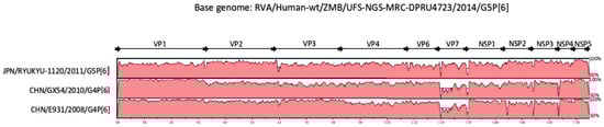 The concatenated whole genome alignment of RVA/Human-wt/ZMB/UFS-NGS-MRC-DPRU4723/2014/G5P[6], together with the Japanese G5P[6] strain and selected Chinese porcine-like human P[6] strains, was visualised (Figure 4). The whole genome of the Zambian G5P[6] strain demonstrated a relatively high degree of conservation with the Japanese G5P[6] strain and the two Chinese G4P[6] strains. With the exception of VP7 and VP4, the genome of the Chinese strain E931 exhibited the overall highest genomic conservation to the study strain. With the exception of VP7, VP3, and NSP1 genes, the Chinese strain GX54 shared a highly conserved genome with the study strain. The Japanese strain Ryukyu-1120 demonstrated a highly similar genome to the study strain for seven of the 11 genes, the exceptions being VP1, VP3, VP6, and VP7. The results of this analysis confirmed the genetic similarity between RVA/Human-wt/ZMB/UFS-NGS-MRC-DPRU4723/2014/G5P[6] and Asian (Chinese) porcine-like human strains, hence suggesting that the Zambian G5P[6] strain may have been derived via reassortment events.
