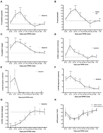 Timeline kinetics of kidney injury markers in HFRS patient plasma and urine. The plasma levels of creatinine (A), urea (B) and cystatin C (C) and the urinary levels of NGAL (D), albumin (E), A1M (F) and ratio of A1M and albumin (G) were quantified in patient plasma obtained at different time points and the estimated mean and standard error of the mean calculated using the generalized estimating equation (GEE) method and compared to follow-up at least 90 days post disease onset using the GEE method. Furthermore, the estimated glomerular filtration rate (eGFR) was calculated based on creatinine (CKD-EPI) or Cystatin C (CAPA) using the GEE method, and differences between eGFR for each time point were calculated using Wilcoxon signed rank test for paired samples (H). Significant differences between the time point and follow-up (#: >90 days post onset of HFRS) (A–G) or between eGFR within the same time point (H) are indicated by asterisks (*** p < 0.001; ** p < 0.01; * p < 0.05). A1M: α-1 microglobulin; CAPA: Caucasian and Asian Pediatric and adult subjects; CKD-EPI: chronic kidney disease epidemiology collaboration; eGFR: estimated glomerular filtration rate; HFRS: hemorrhagic fever with renal syndrome; P: plasma; NGAL: neutrophil gelatinase-associated lipocalin; U: urine.