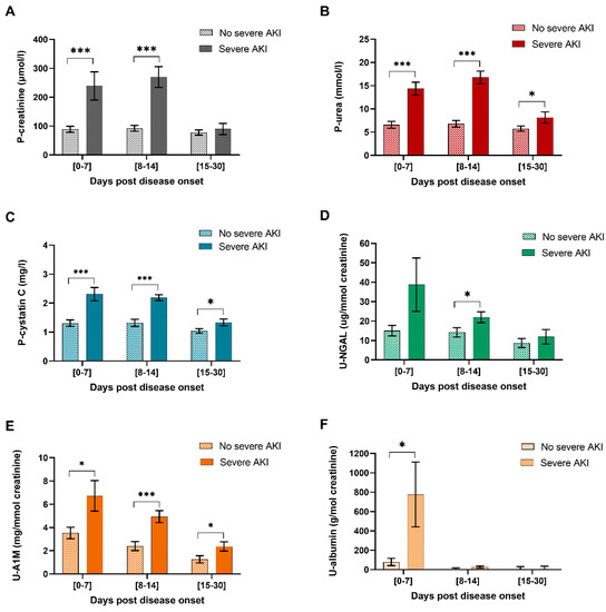 Kidney injury marker levels stratified across HFRS patients with severe AKI. HFRS patients were stratified into two groups of severe AKI (stage 2/3) or not (AKI stage 0/1) according to KDIGO criteria 2012. The estimated mean and standard error of the kidney injury markers for each group were calculated using generalized estimating equation (GEE) and adjusted for sex and age. The timeline kinetics are shown for P-Creatinine (A), P-urea (B), P-cystatin C (C), U-NGAL (D), U-A1M (E) and U-albumin (F). Significant differences within the same time point between kidney injury marker levels in HFRS patients stratified across no severe AKI vs. severe AKI are indicated by asterisks (*** p < 0.001; **p < 0.01; * p < 0.05). A1M: U-α-1 microglobulin; AKI: Acute kidney injury; HFRS: hemorrhagic fever with renal syndrome; P: plasma NGAL: neutrophil gelatinase-associated lipocalin; U: urine.