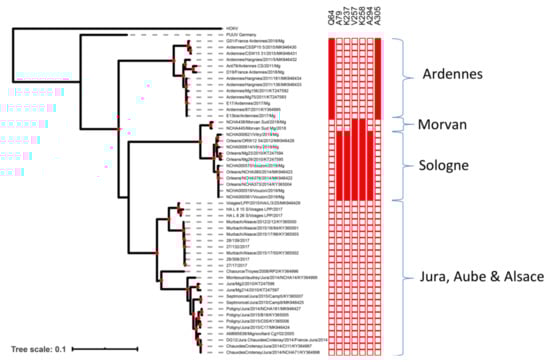 Sequences from Morvan and Sologne were very similar and were included in the same genetic clade. Moreover, they shared two of the five amino-acid signatures (V257 and K258) specific to the Loiret sequences, based on the data obtained in previous studies [] and here. The sequences from bank voles in southern Morvan were found to be very similar to the PUUV sequence isolated from a human patient from the northern part of the Morvan forest in 2012 (GenBank accession number MG923611). Estimated sequence identity reached 97.84% (nt) and 99.76% (aa), corresponding to a single amino-acid difference (position 264). The sequence obtained from the human patient also presented the V257 and K258 amino-acid signatures detected in bank voles from southern Morvan. Finally, as already reported [], sequences from the endemic areas of the Jura, Aube and Alsace were genetically similar and clustered together in a third French cluster.