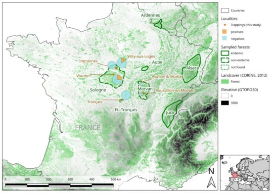 The situation in France is particularly interesting, as the north-eastern quarter of the country lies within the western limits of the area of NE endemicity in Europe, but bank voles are found throughout the country with the exception of Mediterranean areas. A previous epidemiological study found that PUUV-infected rodents could be detected in non-endemic areas, with a high seroprevalence (i.e., areas with no reported cases of NE in humans, such as the forests of Sologne []). The reasons for this absence of NE cases remain unclear []. An understanding of the reasons for this discrepancy between PUUV circulation in bank vole populations and the occurrence of PUUV infections in humans would greatly facilitate public health management [] and improve our ability to predict the risk of PUUV infection in humans [,].