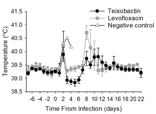 All treatment groups exhibited febrile responses due to the bacterial infection approximately 2 days post-infection (time of infection at Day 0) (Figure 2). These initial temperature elevations subsided in the teixobactin and levofloxacin groups; however, the temperature remained elevated in the negative control group until Day 4 post-infection after which time all the animals in the negative control group had been euthanized. The teixobactin-treated group exhibited a transient decline in temperature 3 to 6 days post-infection that was not seen in the levofloxacin-treated group. Both antibiotic-treated groups had a secondary febrile response within 8 to 12 days post-infection, the magnitude of which appeared greater for the levofloxacin-treated group and less for the teixobactin group; however, differences in temperature among these groups during this time-period (8 to 12 days post-infection) were not significant. Ultimately, the temperatures returned to baseline for both the teixobactin and levofloxacin groups. In view of the fact that fever is a common response to anthrax infection in animal models, these results demonstrate that teixobactin was effective at treating the infection.