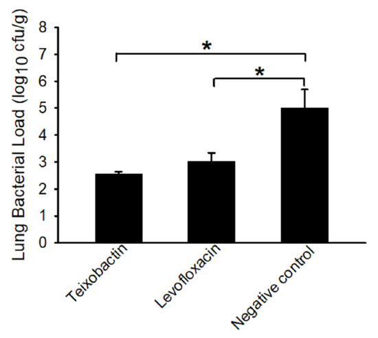 In the case of the teixobactin and levofloxacin-treated animals, the bacteria were detected only in the lungs. The negative control animals, on the other hand, possessed bacteria in the brain, mediastinal lymph nodes, and spleen in addition to the lungs (Table 3). Importantly, the bacterial load in the lung tissue of the antibiotic-treated (teixobactin or levofloxacin) animals was significantly (p-value < 0.05) less than that of the negative control animals (Figure 3). This demonstrates that teixobactin was able to clear B. anthracis from various tissues and limit progression of the infection in the lungs.