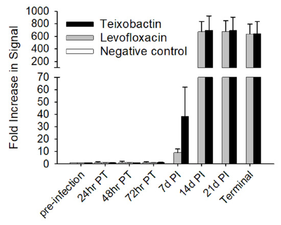 By 14 days post-infection, the animals treated with teixobactin and levofloxacin exhibited dramatic rises in the amount of serum anti-PA antibodies, and the antibody levels remained steady for the remaining time-points (Figure 4). There were no significant differences in serum anti-PA antibody titers between the two antibiotic-treated groups; however, both antibiotic-treated groups had a significant (p-value < 0.05) increase over time. As expected, the negative control group showed no increase in anti-PA antibody levels over time since they succumbed to the anthrax infection before a humoral response could be mounted. These results show that teixobactin provided protection prior to the production of protective anti-PA antibodies.