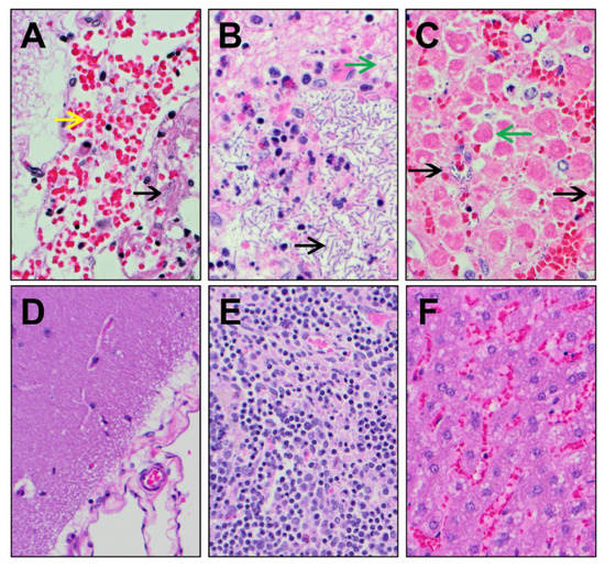 Histopathological images of tissues collected from negative control and teixobactin-treated animals. Tissues sections were routinely processed, embedded in paraffin, sectioned at 5 µm, and stained with hematoxylin and eosin (H & E), and then evaluated by light microscopy. (A) Brain, (B) mediastinal lymph node, and (C) liver tissues collected from negative control animals (at 400× magnification) showed the presence of B. anthracis rods (black arrow), hemorrhage (yellow arrow), and/or necrosis (green arrows). The (D) brain, (E) mediastinal lymph node, and (F) liver tissues collected from teixobactin-treated animals (at 200× magnification) showed minimal pathology with no B. anthracis rods.