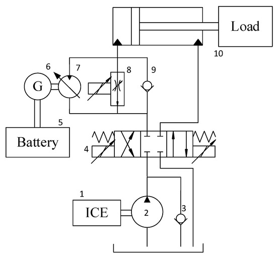- Wang, T.; Wang, Q. An Energy-Saving Pressure-Compensated Hydraulic System With Electrical Approach. IEEE/ASME Trans. Mechatron. 2014, 19, 570–578. [Google Scholar] [CrossRef]
