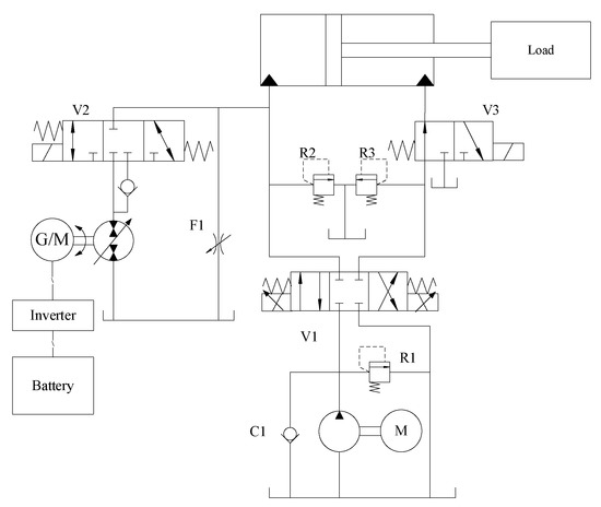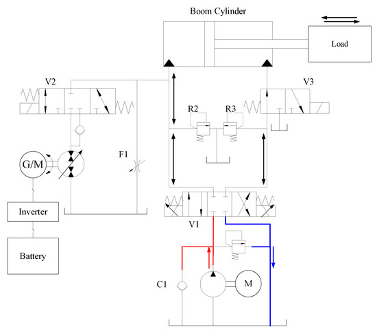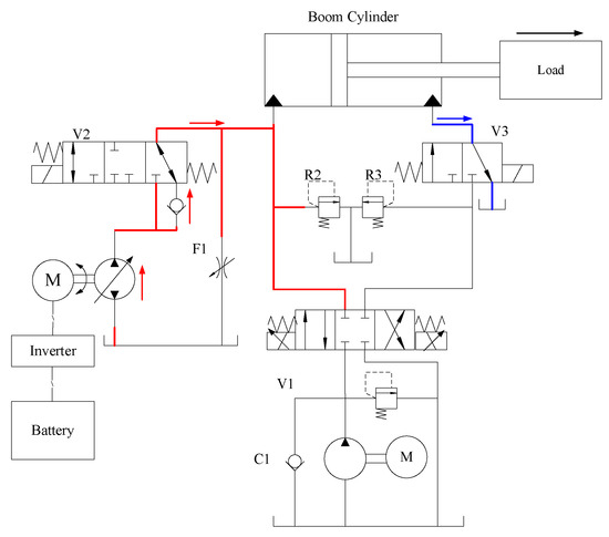 In the first working mode, the proposed system operates normally as a conventional valve-controlled hydraulic system as shown in Figure 3. Since the 3-way 3 positions directional valve V2 is closed and the 3-way directional valve V3 is set in the left position, the direction, as well as the amount of flow, is both managed by the 4-way directional valve V1. As the result, operations of the boom cylinder are totally governed by the operator by controlling this valve. Although no energy is saved during this period, this mode ensures that the system can still function properly in case of unexpected failures from energy recovery components. Moreover, it is well known that the valve-controlled system provides the fastest response which can be crucial in different real-life scenarios.