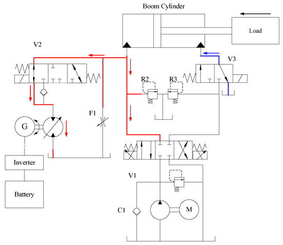 The energy regeneration mode is described graphically via Figure 4. During boom-down operation, since arm and bucket weight as well as possibly heavy load are exerting considerable pressure on the boom cylinder, the retraction process can occur naturally as a result of gravity. As the rod goes down, oil being pushed out of the piston chamber flows toward the hydraulic motor via the valve V2, which is at its left connection. The amount of hydraulic energy existing as the potential energy of the piston rod is converted into electrical energy by the generator and after that stored in a battery unit. In this mode, the main valve is set right in the middle position such that the main motor and pump can run idly. The retraction speed can be regulated by adjusting the torque of the electric generator. Under the large-load and high-velocity condition, the flow control valve F1 is then activated to rapidly alleviate the load with the hydraulic motor, as a result, ensuring good performance of the system.