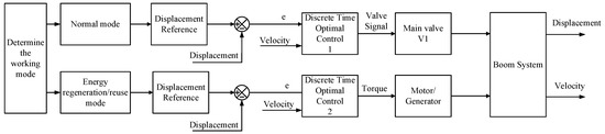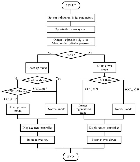 The control strategy for the proposed system is shown in Figure 6. When the system starts to operate, the system initial parameters are set to keep the current state. The operator controls the boom cylinder by using the joystick signal. We assume that the negative and positive joystick signal corresponds to the boom cylinder moving down and up, respectively.