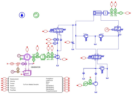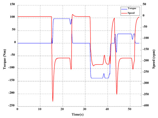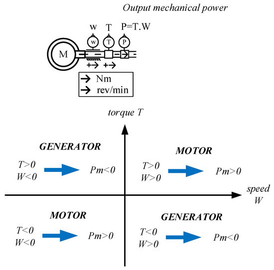 In order to completely validate the effectiveness of the proposed ERS, the co-simulation model was built in the LMS AMESim software (2019a) and Matlab 2017a as shown in Figure 8. In details, the hydraulic components are presented in blue blocks, the mechanical parts are simulated by the green blocks and the electrical devices are illustrated in the purple block, the control signals are expressed via the red functions. Two simulation software were communicated via S-Function. The configuration parameters of the proposed system are shown in Table 1. The used electric motor/generator is reversible; it can work either as a motor or as a generator. Using the motor convention, the rotor relative speed can be measured with W as an output speed at the mechanical port, and the torque can be measured with T as an output torque at the mechanical port. When W and T are of same sign, the machine is working as a motor, and the output mechanical power P is positive. When W and T are of opposite sign, the machine is working as a generator and the output mechanical power P is negative as shown in Figure 9. To meet the requirements of the energy management strategy, the initial SOC of battery is chosen 0.6. This parameter will vary depending on the energy regeneration mode or energy reuse mode during operation. The number of cells in series determines the current and voltage of the battery. If the voltage and current are too big, they can damage the device and endanger the operator. The number of cells in parallel determines the capacity of the battery. This parameter is selected to suit the excavator operating for a long period of time without exceeding the threshold limit in energy management strategy.