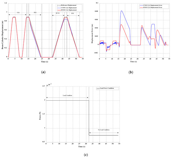 Displacement (a), error of the boom cylinder (b) and load force condition (c) (NM: normal mode, RM: regeneration mode, RUM: Reuse mode).