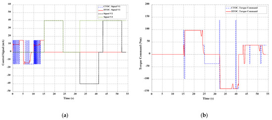 The displacement, displacement error, and load force condition of the boom cylinder are shown in Figure 10. From the 0 s to 8 s, the system run in the normal mode. The boom cylinder took three seconds to reach 0.9 m and took more than 3 s to fully retract. In the next cycle, the boom cylinder worked in the energy regeneration mode. During the extension process, the cylinder was supplied the flow rate from the main pump. From 15 s, the boom cylinder moved down, and the potential energy in the bore chamber was converted to electrical energy via the energy conversion components. In the final cycles, the hydraulic power was supplied by the electrical motor/generator and hydraulic pump/motor. Besides, to show the effectiveness of the proposed energy management strategy based on the DTOC controller, a simulation comparison with energy management strategy based on the CTOC controller was made. The CTOC controller could achieve a smaller error than DTOC controller during the normal mode operation. However, DTOC controller reduced the chartering phenomenon and helped the boom cylinder smoothly moving which clearly be shown in the control signal in Figure 10a. During the regeneration mode, the DTOC could give a more suitable signal, making the cylinder closer to the desired position from 41 s to 43 s. In addition, it could be seen that the control by the main valve helped the cylinder have better performance than the control by the generator. However, the error when controlled by the generator was also small in about 6% as shown in Figure 10b. This was an acceptable error in the boom system. The control signals were within the allowable working range of each device as shown in Figure 11. Therefore, these results proved that the control strategy could ensure the system to operate safely and accurately.