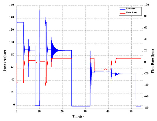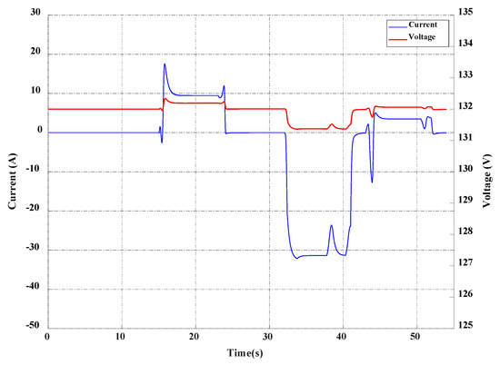 Figure 12 showed the pressure and flow rate of the boom cylinder. During the operation, the maximum volume that flows into the chamber was 38 lpm. The pressure of the boom cylinder was 135 bar in the load condition. The speed and torque of the electrical motor/generator were presented in Figure 13. The speed and torque were different signs when the electric motor/generator operated in the generator mode to recover energy. From the 32 s to 43 s, the electrical motor/generator worked in the motor function. Therefore, the speed and torque were the same signs. The highest torque and speed of the electrical motor/generator were 400 rpm and 200 Nm in the energy reuse mode. In addition, the voltage and current of the battery were shown in Figure 14. Then, the regenerated energy of the proposed system could be estimated.