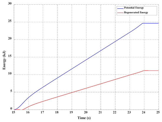 Based on the above equations, Figure 15 showed the energy analysis of the proposed ERS. From the simulation results, the potential energy and regenerated energy were 24.9 kJ and 10.956 kJ. Then, the energy regeneration efficiency of the system could achieve 44%.