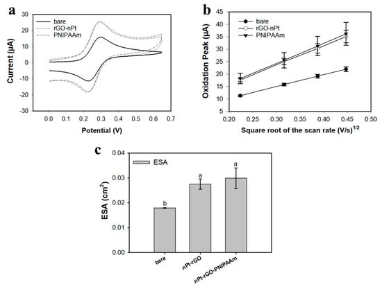 Cyclic voltammograms in 4 mM Fe(CN)63−/Fe(CN)64− + 1 M KNO3 (pH = 7.1, T = 25 °C) displayed quasi-reversible redox peaks for all nanomaterials tested, with peak potential separations in the 70 to 80 mV range. Figure 1a shows representative CV curves for bare Pt/Ir electrodes, Pt/Ir electrode after coating with the metal/carbon nanohybrid (nPt-rGO), and the nanohybrid electrode after deposition of nanobrushes (PNIPAAm). Figure 1b was used to calculate the ESA for each electrode. As shown in Figure 1c, the average ESA for nanohybrid electrodes coated with PNIPAAm (0.03 ± 0.004 cm2) was equivalent to nanohybrid electrodes (0.028 ± 0.002 cm2), and significantly higher than bare Pt/Ir electrodes (0.018 ± 0.0001 cm2; p < 0.05), similar to the findings reported by Burrs et al. [41].