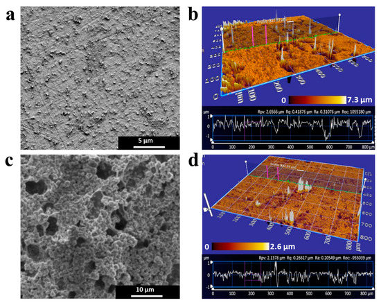 Morphological characterization by scanning electron microscopy (SEM) and scanning white light interferometry (SWLI). (a) SEM image for nanohybrid (nPt-rGO) electrode showing homogenous coating with an average feature size of 220 to 1300 nm. (b) Average roughness (Ra) for nPt-rGO calculated from SWLI contour profiles (310.2 nm) indicates a heterogenous surface and irregular abrasions. (c) SEM images show a relatively homogenous coating for nanobrush-coated nPt-rGO electrodes (PNIPAAm) with terminal nodes 910 ± 305 nm in diameter. (d) PNIPAAm-coated electrodes had a more homogenous and smooth coating, with an average Ra of 201.4 nm.