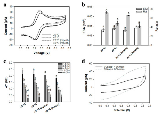 The maximum impedance values were observed at a cutoff frequency of 1 Hz; analysis considered frequencies from 1 to 50 Hz, which falls within the alpha dispersion domain [64]. No significant difference (p > 0.05) was observed between the different temperatures of actuation (Figure 3c). The data in Figure 3c indicate some degree of hysteresis after repeated actuation of bioreceptor-PNIPAAm nanobrushes. After repetitive actuation, peak current changed by 4.0 ± 1.5%, while Rct varied by 13 ± 4%. Repetitive actuation of bioreceptor-nanobrush structures has not been reported previously, and warrants further study to determine the best mechanism for actuation.