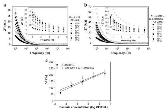 Figure 4 shows PNIPAAm-ConA nanohybrid electrodes calibrated for E. coli K12 and in the presence of Salmonella. All tests used the actuation protocol previously established (see Figure 3), with capture in the extended state at 20 °C and sensing in the collapsed state at 40 °C. Bode plots are shown over a frequency range of 1 Hz to 100 kHz at varying bacteria concentrations (102–107 CFU/mL); insets are a zoomed in view of the lower frequency range (1–5 Hz). Based on a frequency analysis using the procedure by Hills et al. [49] and presented in Figure 3c, all calibration curves were developed using data from Bode plots for a cutoff frequency of 1 Hz. The total test time was 17 min, which included 15 min for bacteria capture and 2 min for the EIS measurement.