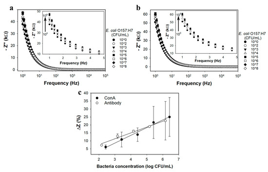 ConA-nanobrush and Ab-nanobrush (Anti-GroEL) biosensors were tested with E. coli O157:H7 at concentrations ranging from 102 to 108 CFU/mL in sterile vegetable broth using the actuation protocol described above. Figure 5a,b present Bode plots over a frequency range of 1 Hz to 100 kHz for ConA-nanobrush and Ab-nanobrush biosensors, respectively (see supplementary Figure S9 for Nyquist plots).