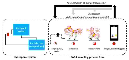 Simplified schematic of SARA system, highlighting actuation at the macroscale (microcontrollers used to activate/deactivate pumps) and the nanoscale (polymer swelling/collapse during bacteria capture).