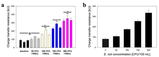 Replicate impedance data for actuation of E. coli biosensors in hydroponic lettuce system. (a) Average charge transfer resistance for all tests, with colored bar charts indicating equivalent bacteria concentration. The three successive values represent impedance data obtained at 20 °C (extended nanobrush), 40 °C (collapsed nanobrush), and return to 20 °C (extended brush + bacteria). (b) Average sensor calibration using using an extend–capture, collapse–measure scheme. For simulating contamination, 10 mL of an E. coli (ATCC 35218) stock suspension was injected into a T-junction placed upstream of the particle trap/biosensor apparatus. All data represents the average of three repetitions. Error bars represent standard deviation. Different letters denote significantly different means (p < 0.05).