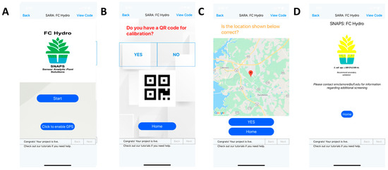 Select screenshots of SNAPS FC Hydro decision support app. (A) Welcome screen with option for location accuracy. (B) QR code scanner option for batch calibration input; (C) Location accuracy for decision support; (D) Example of result indicating sample requires further processing and may be contaminated with E. coli (>100 CFU E. coli/100 mL).