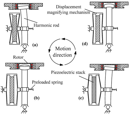 Working principle of the low-frequency harmonic rotating piezoelectric actuator. (a) The position of 0 degrees or 360 degrees; (b) The positions of 90 degrees; (c) The positions of 180 degrees; (d) The positions of 270 degrees.