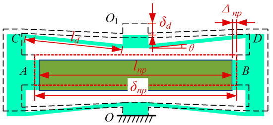 Figure 2 shows the deformation of displacement amplification mechanism. Here, O point is fixed end and O1 point is free extension end. When the system is working, the two ends (points A and B) of the piezoelectric stack are stretched and deformed along the axis. The flexible arms, O1C and O1D, of the displacement amplification mechanism rotate slightly around points C and D. Thus, the free end O1 produces an overhanging displacement.