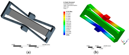 At the same time, to verify the correctness of the theoretical calculation model, ANSYS finite element analysis software is used to carry out finite element simulation of the displacement amplification mechanism, which is presented in Figure 6. Here, Figure 6a shows mesh generation of the displacement amplification mechanism. The grid size is set by 0.5 mm. Hence, after mesh generation, the number of nodes and cells is 113,943 and 40,692, respectively.