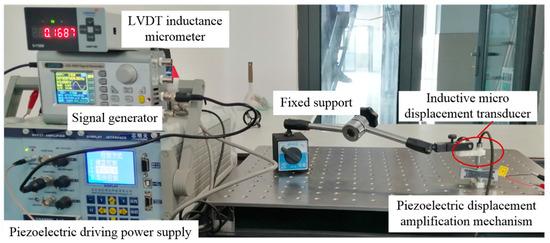 Meanwhile, the output displacement experiment of piezoelectric displacement amplification mechanism is carried out to further verify the correctness of the theoretical calculation. The displacement amplification mechanisms and piezoelectric stacks for the experiment were manufactured by the Harbin Tiny Nano Company. Figure 7 presents the experimental test system for the piezoelectric displacement amplification mechanism. Here, the piezoelectric drive power supply adopts the three-channel power supply produced by the Harbin Core Tomorrow Company. The output displacement of the piezoelectric displacement amplifier is measured by LVDT inductance micro displacement measuring instrument. In addition, JUNTEK JDS-2900 signal generator was used to provide sinusoidal drive signals for the piezoelectric stacks. The experimental results of output displacement are shown in Figure 8, where Figure 8a–c represents the measured displacement of piezoelectric displacement amplification mechanisms 1 and 2, as well as the error between the measured value and the theoretical value, respectively. The experimental results indicate that: