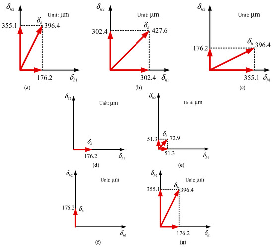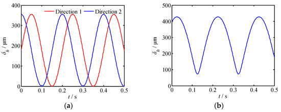 (1) The harmonic displacements in both directions vary with time by sinusoidal curves; the phase difference is 90 degrees, which is the same as the input signal. The total displacement is approximately sinusoidal with time, and the frequency is the same as the input signal, but the phase is different. Herein, the total displacement is the superposition of the displacements in directions 1 and 2, and the phase difference of the displacement signals in the two directions is 90 degrees. Therefore, there is no case of both being 0, so the total displacement is always greater than 0 in Figure 9b.