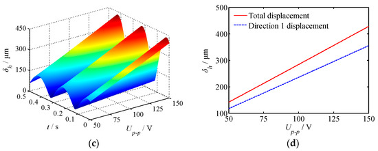 Calculation results of harmonic displacement. (a) Output harmonic displacement in both directions; (b) Total harmonic displacement; (c) Harmonic displacements that vary with time and voltage; (d) Comparison of total displacement and unidirectional displacement.