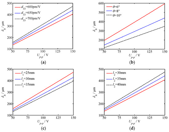 To investigate the influence of system parameters on harmonic displacement, the parameters’ piezoelectric strain constant d33, the angle between the flexible arm and the horizontal θ and the length of harmonic rod l1 and l2 are selected as target parameters. The analysis results are shown in Figure 11. From the figure, we see that: