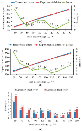 Experimental results of harmonic displacement for the proposed piezoelectric actuator. (a) Direction 1 test results; (b) Direction 2 test results; (c) The error between the experimental result and the theoretical calculation.