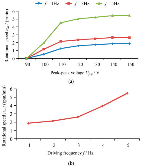 (2) When the driving voltage is constant, the output speed presents a nonlinear increase trend with the increase of driving frequency. At the same time, the experimental results show that the piezoelectric actuator operates smoothly under different driving frequencies.