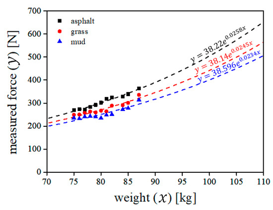 It is known that the force that a person receives while walking is concentrated towards the heel, a metatarsophalangeal joint, and toe [17]. Based on this, we attached three force sensors on the insole (at the heel portion, a metatarsophalangeal joint portion, and the toe portion) and measure the forces. After that, we asked the participants to walk on mud, grass, and asphalt. During walking, force data sets, which were obtained from the attached force sensors, were transmitted to a remote personal computer using wireless communication (Bluetooth). Eleven people weighing between 75 kg and 87 kg, participated in this test. All participants were between 23 and 28 years of age (average age: 26 years). To enhance the reliability, this procedure was repeated five times for each ground condition (mud and asphalt). Therefore, the total number of trials was 55 for each ground condition, considering 11 participants. As expected, the force obtained from the heel was the strongest among the three forces (from the heel, the metatarsophalangeal joint, and the toe). Figure 1 shows the results of the maximum resistive forces when subjects walked on the two ground types. As expected, the resistive force on the asphalt was larger than that on the mud. Furthermore, the resistive force was proportional to the user’s weight. We fitted the data into a mathematical model, which represented the relationship between human weight () and resistive force (). From the mathematical model (), if a person weighs 100 kg, the resistive force is expected to be 504 N. By considering the force margin, we set the design goal of our MR actuator as 600 N.