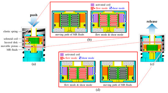 Operating principle and mechanism of the proposed MR actuator: (a) At the resting state (not pressed); (b) Operating principle when push is applied; (c) At the pressed state; (d) Operating principle when push is released.