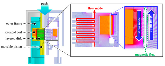 The design goal of the MR haptic actuator is to maximize its resistive force in the limited size of an actuator by integrating multiple modes (flow mode and shear mode) of MR fluids. A finite element method (FEM) simulation was performed using commercial software (Ansys Maxwell) to investigate whether multiple operation modes of MR fluids contribute to the actuation of the proposed module at the same time. Furthermore, we checked that the magnetic field flows well, forming a close path with minimal magnetic loss. Figure 5 shows the simulation results of the proposed actuator. The simulation results indicate that the magnetic field created by the solenoid coil passes along the movable piston and outer frame, and returns to its original position, resulting in a closed path. This means that there is little magnetic flux leakage in the proposed design, and most of the magnetic field generated by the solenoid coil contributes to haptic actuation. Moreover, we found that the proposed MR actuator was designed to use multiple operation modes (shear and flow modes) of MR fluids so that the resistive force was maximized in a limited size. We confirmed that magnetic flux is perpendicular to the shear direction in the outer peripheral part through Figure 5. When the piston moves downward, the MR fluids flow through the gap between the movable piston and the outer frame, which creates shear stress (shear mode). Furthermore, the MR fluids flow through holes in the layered disk and through the gap between the disk and its neighbor. This flow of the MR fluid generates the yield stress (flow mode). Therefore, as the user pushes the proposed actuator, he/she can perceive the feedback force, which is determined by summing up the shear and yield stresses created by the MR fluids.